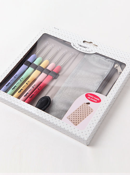 + 레이스 겸용 비즈 코바늘 5개와 편리하고 귀여운 파우치가 포함되어 있는 세트입니다.