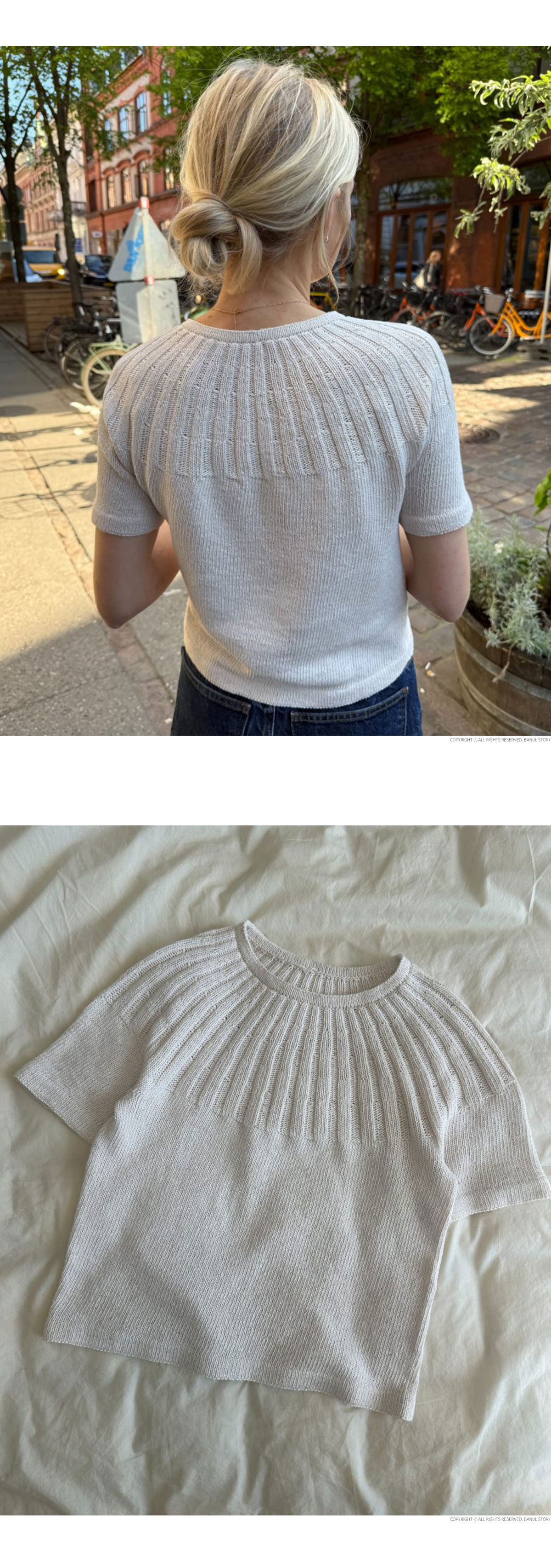 The Sunday Tee는 탑다운 방식으로 제작됩니다. 요크 부분은 점차 코가 늘어나는 고무뜨기로 떠줍니다. 요크가 끝나면 뒷목 부분을 높이기 위해 되돌아뜨기를 작업을 합니다. 몸통과 소매 부분은 원형으로 뜨며 메리야스 뜨기로 작업하고 끝단을 접어서 마무리 해줍니다.