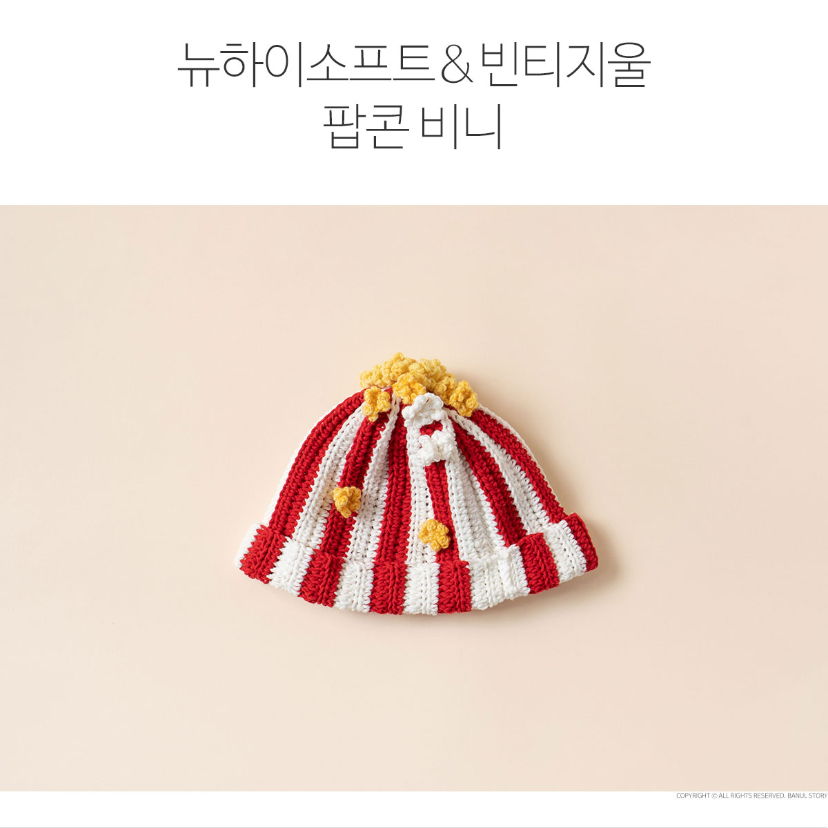 사진 찍을 때 특히 좋은, 팝콘 통에 담긴 팝콘을 형상화한 재치 있는 형태의 팝콘 비니입니다. 부드러운 실 하이소프트로 모자 편물을 떠 자극 없이 착용할 수 있으며, 팝콘은 빈티지울 2겹으로 생생한 현실감을 살려 주었답니다. 도안은 성인용 원사이즈 기준으로 서술되어 있으며, 동영상 강의는 사이즈 조절하는 방법을 알려드리고 직접 적용해보며 아동용 사이즈로 뜨는 과정을 보여드립니다. 패키지는 성인용 비니 2개 분량이며, 튜토리얼에서 완성된 아동용 사이즈는 뉴하이소프트가 색상별로 반 볼 정도 사용되었으니 참고 부탁드려요.
