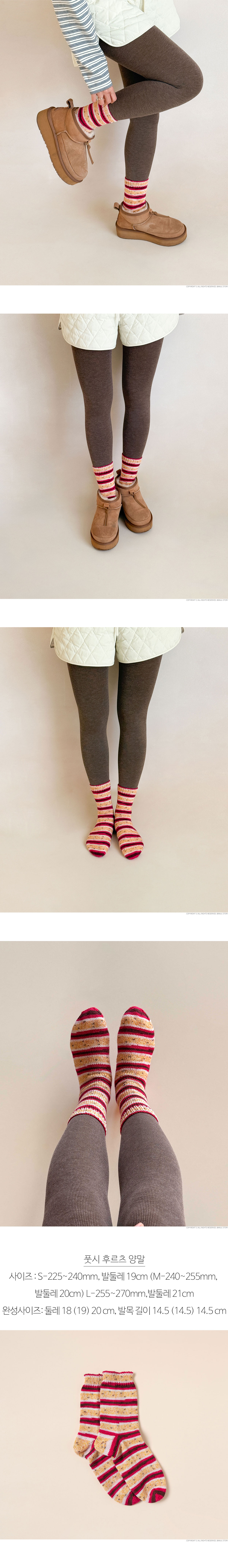 + 사이즈: S-225~240mm, 발둘레 19cm (M-240~255mm, 발둘레 20cm) L-255~270mm,발둘레 21cm(※완성치수는 뜨개방법과 솜씨에 따라 사이즈의 오차가 생길 수 있습니다.)