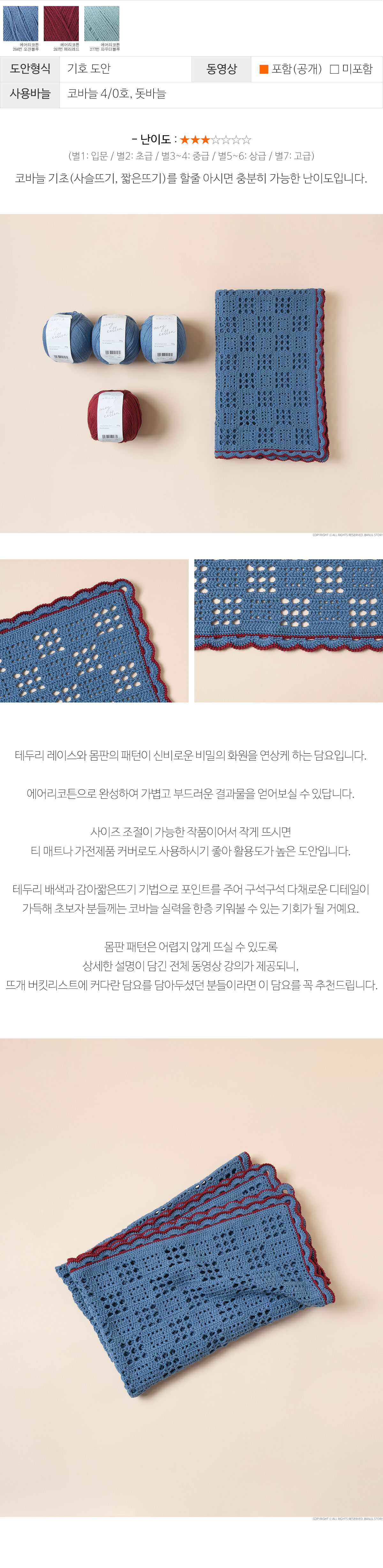 테두리 레이스와 몸판의 패턴이 신비로운 비밀의 화원을 연상케 하는 담요입니다. 에어리코튼으로 완성하여 가볍고 부드러운 결과물을 얻어보실 수 있답니다. 사이즈 조절이 가능한 작품이어서 작게 뜨시면 티 매트나 가전제품 커버로도 사용하시기 좋아 활용도가 높은 도안입니다. 테두리 배색과 감아짧은뜨기 기법으로 포인트를 주어 구석구석 다채로운 디테일이 가득해 초보자 분들께는 코바늘 실력을 한층 키워볼 수 있는 기회가 될 거예요. 몸판 패턴은 어렵지 않게 뜨실 수 있도록 상세한 설명이 담긴 전체 동영상 강의가 제공되니, 뜨개 버킷리스트에 커다란 담요를 담아두셨던 분들이라면 이 담요를 꼭 추천드립니다.