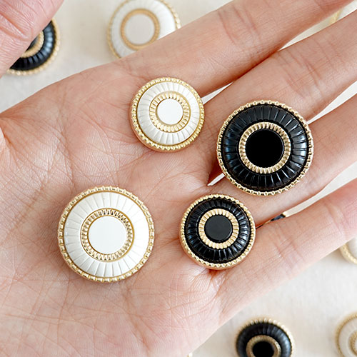 + 둥근 형태에 2개의 고급스런 골드색상의 줄무늬가 포인트로 자리한 단추입니다.