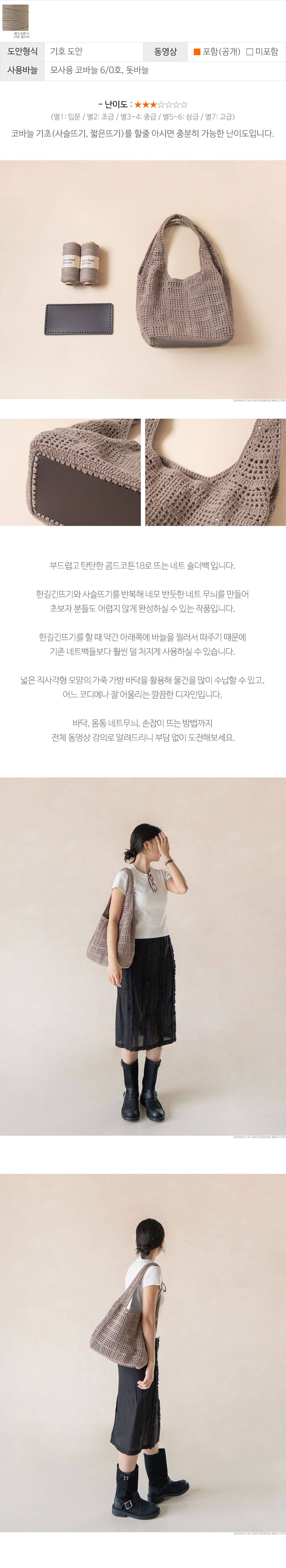 부드럽고 탄탄한 콤드코튼18로 뜨는 네트 숄더백 입니다. 한길긴뜨기와 사슬뜨기를 반복해 네모 반듯한 네트 무늬를 만들어 초보자 분들도 어렵지 않게 완성하실 수 있는 작품입니다. 한길긴뜨기를 할 때 약간 아래쪽에 바늘을 찔러서 떠주기 때문에 기존 네트백들보다 훨씬 덜 처지게 사용하실 수 있습니다. 넓은 직사각형 모양의 가죽 가방 바닥을 활용해 물건을 많이 수납할 수 있고, 어느 코디에나 잘 어울리는 깔끔한 디자인입니다. 바닥, 몸통 네트무늬, 손잡이 뜨는 방법까지 전체 동영상 강의로 알려드리니 부담 없이 도전해보세요.