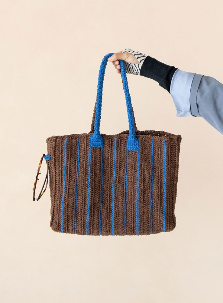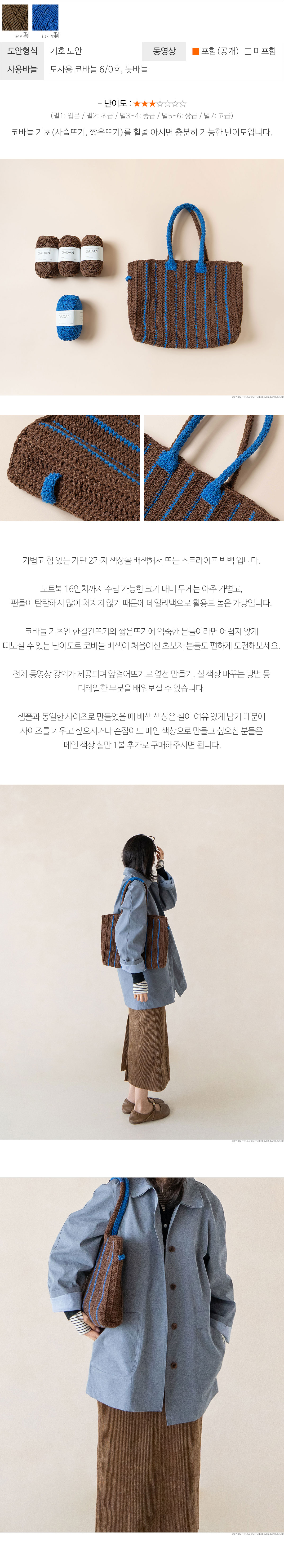 가볍고 힘 있는 가단 2가지 색상을 배색해서 뜨는 스트라이프 빅백 입니다. 노트북 16인치까지 수납 가능한 크기 대비 무게는 아주 가볍고, 편물이 탄탄해서 많이 처지지 않기 때문에 데일리백으로 활용도 높은 가방입니다. 코바늘 기초인 한길긴뜨기와 짧은뜨기에 익숙한 분들이라면 어렵지 않게 떠보실 수 있는 난이도로 코바늘 배색이 처음이신 초보자 분들도 편하게 도전해보세요. 전체 동영상 강의가 제공되며 앞걸어뜨기로 옆선 만들기, 실 색상 바꾸는 방법 등 디테일한 부분을 배워보실 수 있습니다. 샘플과 동일한 사이즈로 만들었을 때 배색 색상은 실이 여유 있게 남기 때문에 사이즈를 키우고 싶으시거나 손잡이도 메인 색상으로 만들고 싶으신 분들은 메인 색상 실만 1볼 추가로 구매해주시면 됩니다.