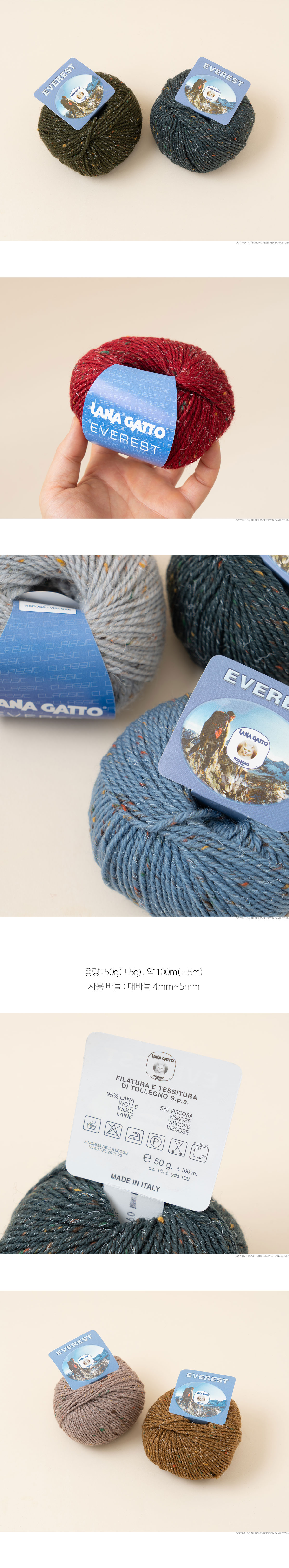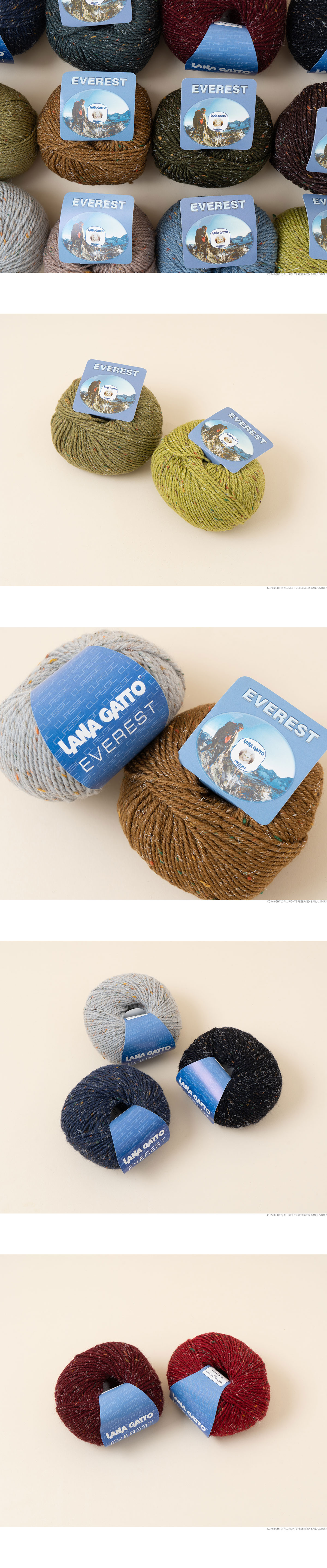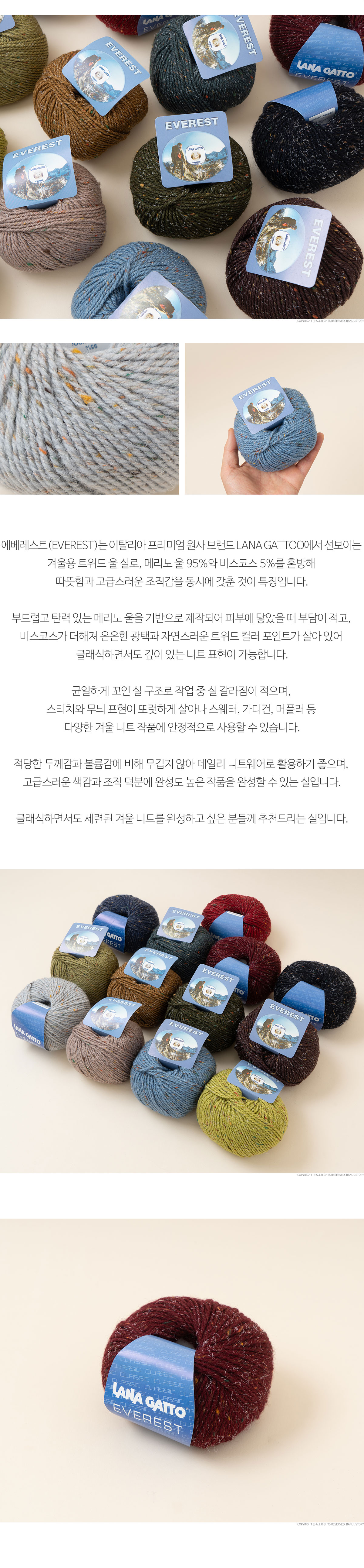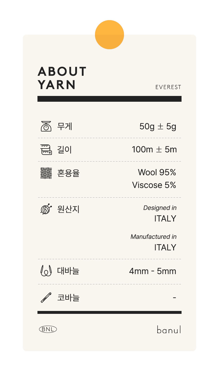 + 에베레스트(EVEREST)는 이탈리아 프리미엄 원사 브랜드 LANA GATTO에서 선보이는 겨울용 트위드 울 실로, 메리노 울 95%와 비스코스 5%를 혼방해 따뜻함과 고급스러운 조직감을 동시에 갖춘 것이 특징입니다.