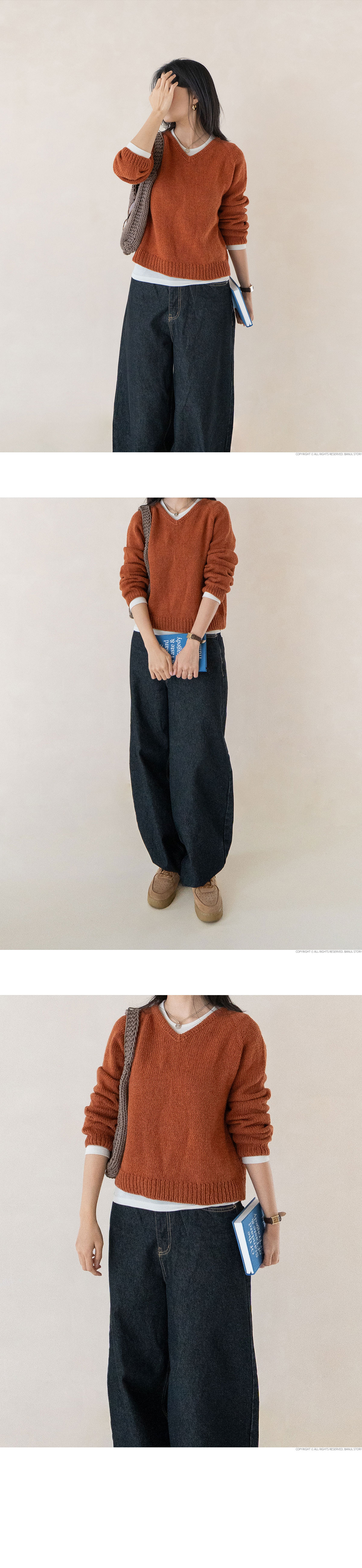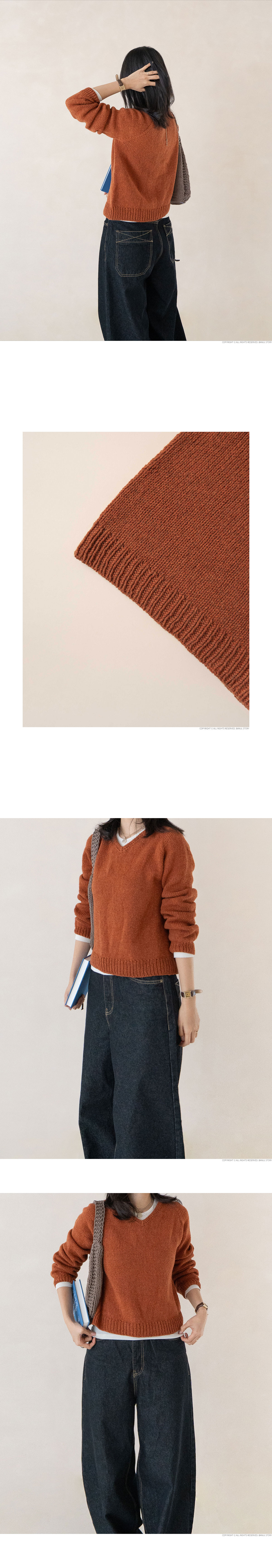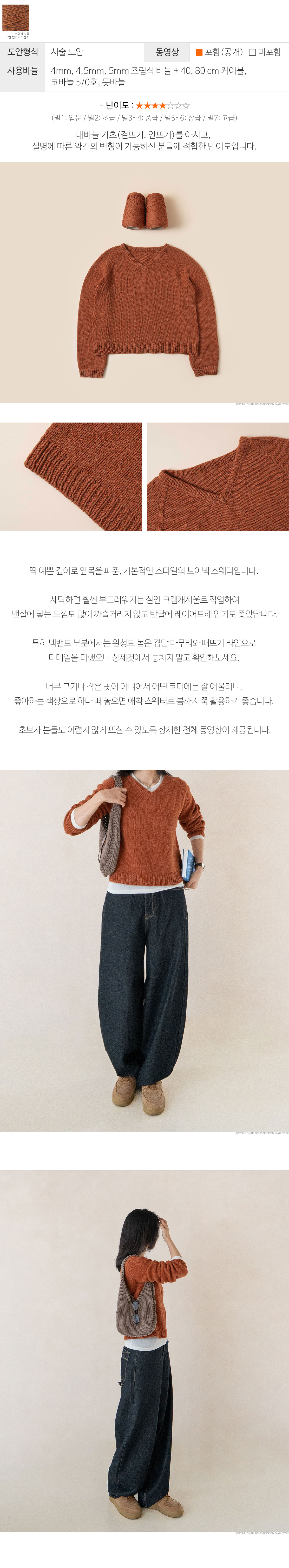 딱 예쁜 깊이로 앞목을 파준, 기본적인 스타일의 브이넥 스웨터입니다. 세탁하면 훨씬 부드러워지는 실인 크렘캐시울로 작업하여 맨살에 닿는 느낌도 많이 까슬거리지 않고 반팔에 레이어드해 입기도 좋았답니다. 특히 넥밴드 부분에서는 완성도 높은 겹단 마무리와 빼뜨기 라인으로 디테일을 더했으니 상세컷에서 놓치지 말고 확인해보세요. 너무 크거나 작은 핏이 아니어서 어떤 코디에든 잘 어울리니, 좋아하는 색상으로 하나 떠 놓으면 애착 스웨터로 봄까지 쭉 활용하기 좋습니다. 초보자 분들도 어렵지 않게 뜨실 수 있도록 상세한 전체 동영상이 제공됩니다.