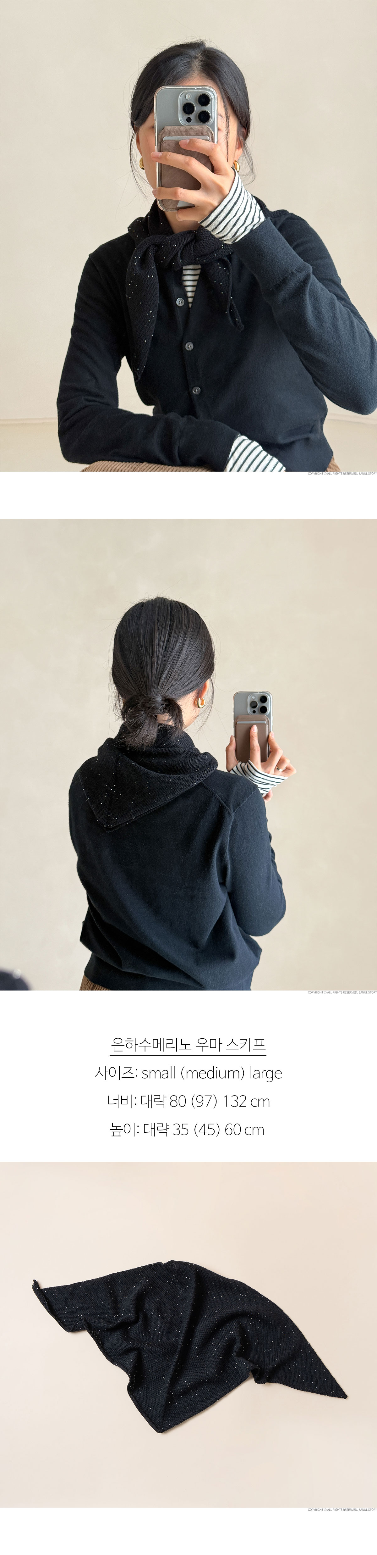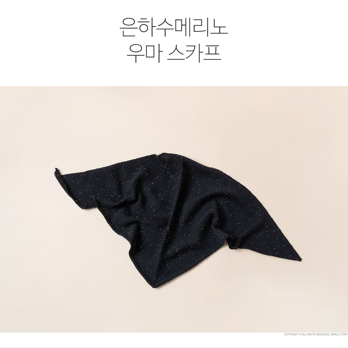 우마 스카프는 중심에서 시작하여 바깥쪽으로 늘리면서 뜨는 구조로, 겉면에서 늘림이 진행됩니다. 은하수메리노 2겹으로 작업하여 가볍고 찰랑이는 편물로 완성됩니다. 비즈가 콕콕 박혀있지만 촉감에 전혀 거슬림 없이 부드럽고 반짝반짝 예쁘답니다. 원작은 캐시미어실 1겹, 3mm 대바늘을 사용하지만 은하수 메리노 실로 뜨실 경우 실 2겹, 3.5mm 바늘을 사용해 주시기 바랍니다. 스카프 양 옆 가장자리 배색을 원하시면 실을 추가 구매해 주셔야 합니다.
