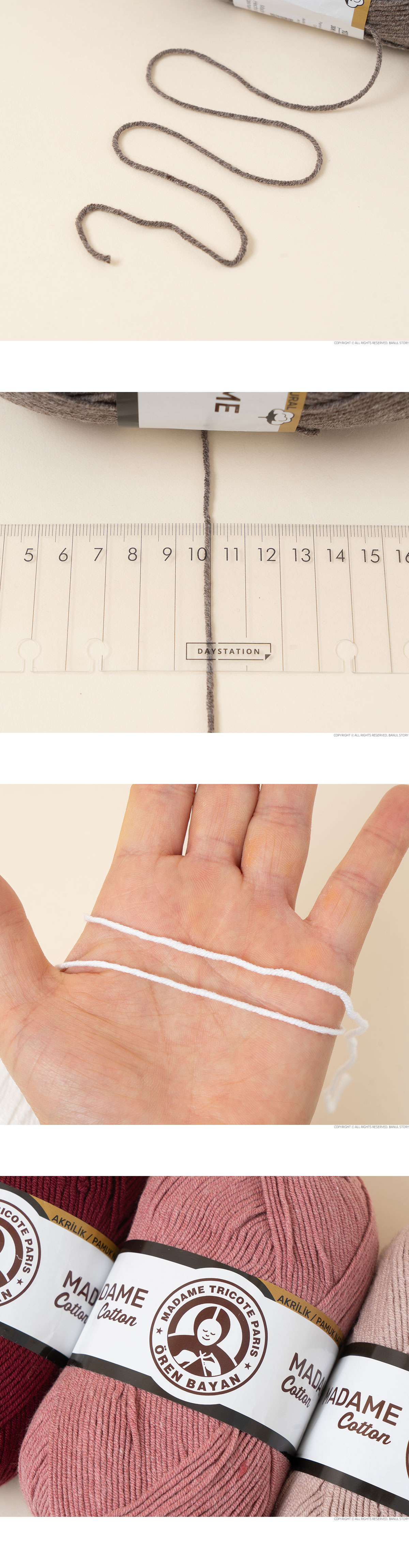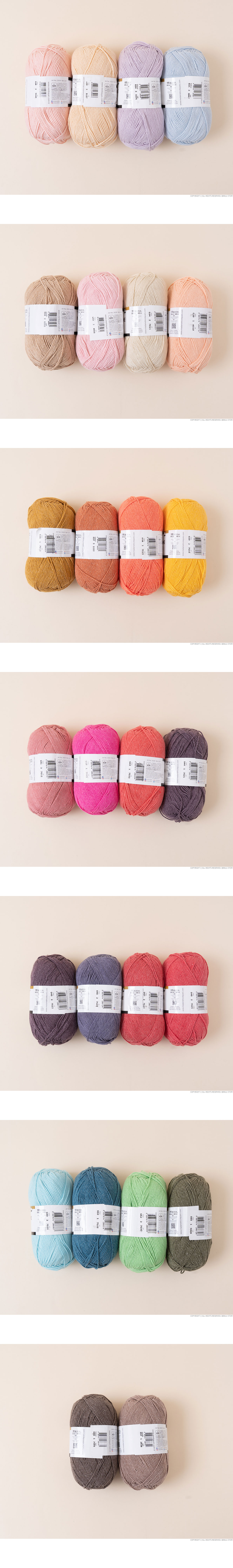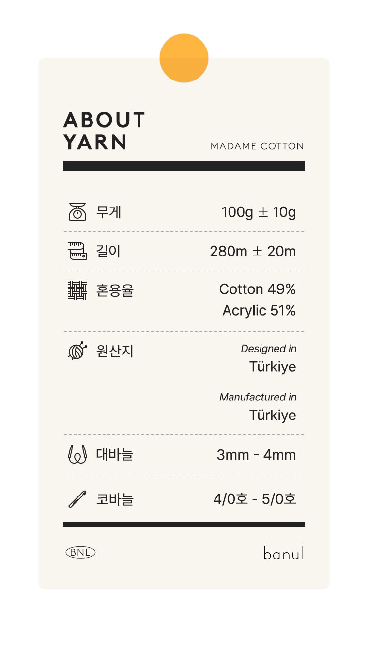 + 특히 국세 아크릴이 더해져 내구성과 형태 유지력이 뛰어나, 코바늘이나 대바늘 모든 오동통한 조직감 자랑하며,  의류는 물론 다양한 소품 제작에도 안정적으로 활용할 수 있습니다. 또한 통기성과 가벼움을 동시에 갖추고 있어 사계절 활용이 가능하며, 여름용 가벼운 니트부터 일상 소품까지 폭넓게 어울립니다.