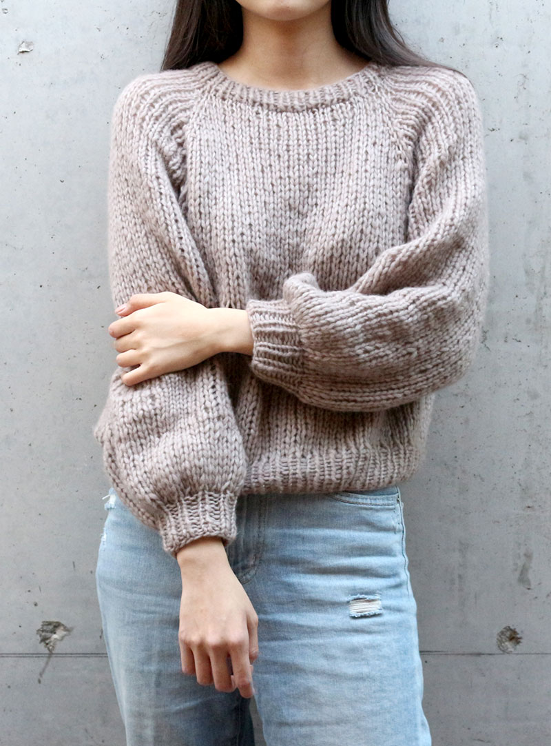 무게감이 거의 느껴지지 않는 포근한 느낌의 스웨터입니다. 풍선처럼 부풀린 소매가 특징으로 러블리한 느낌으로 어렵지 않게 뜨실 수 있는 탑다운 스타일의 스웨터 입니다. 도안은 서술형으로 설명되어 있습니다.