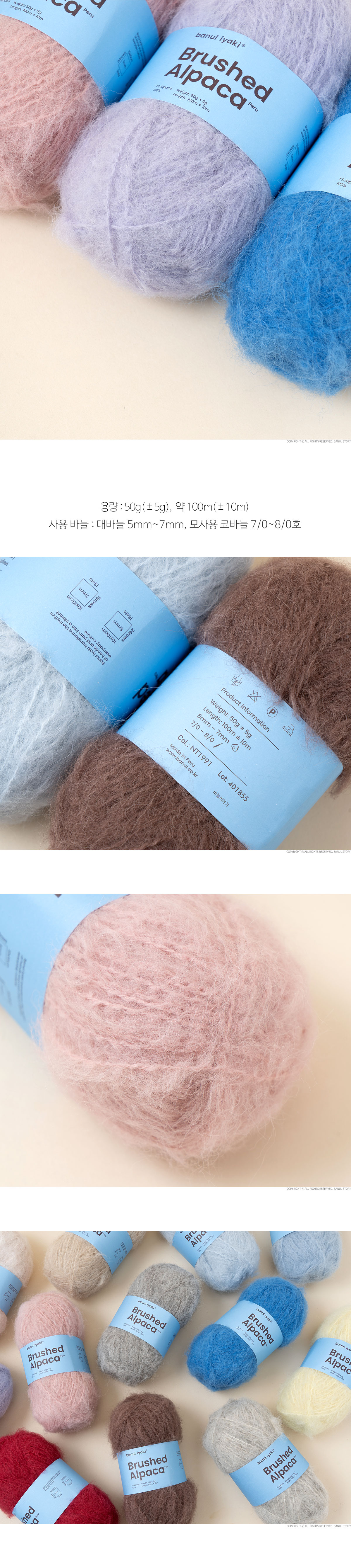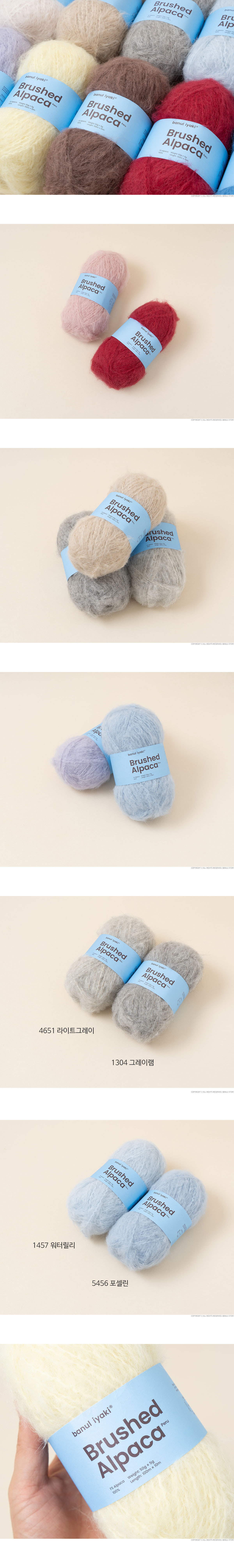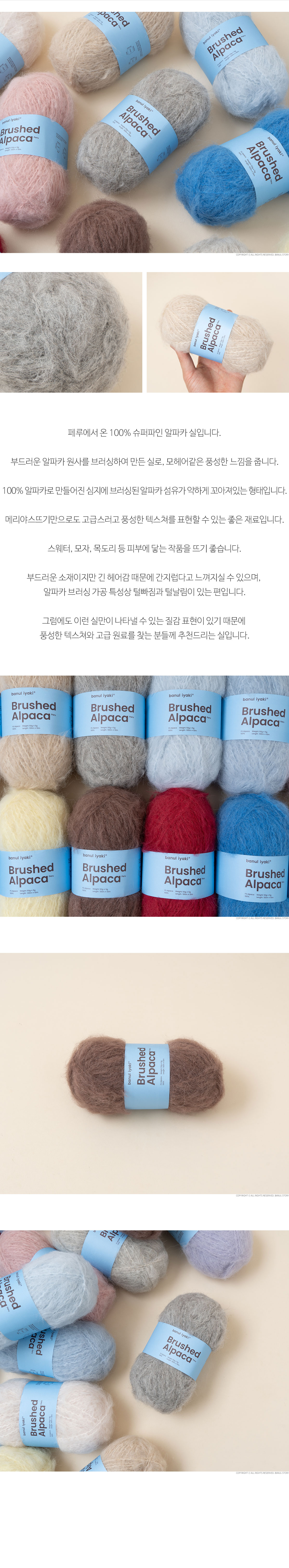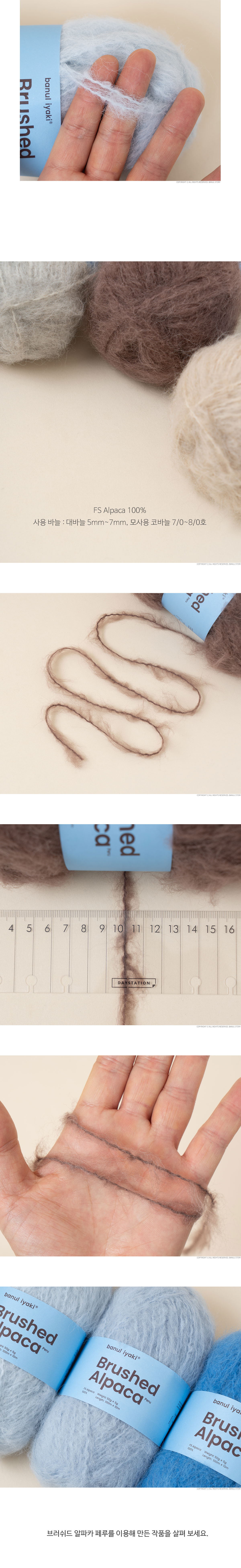 + 100% 알파카로 만들어진 심지에 브러싱된 알파카 섬유가 약하게 꼬아져있는 형태입니다.