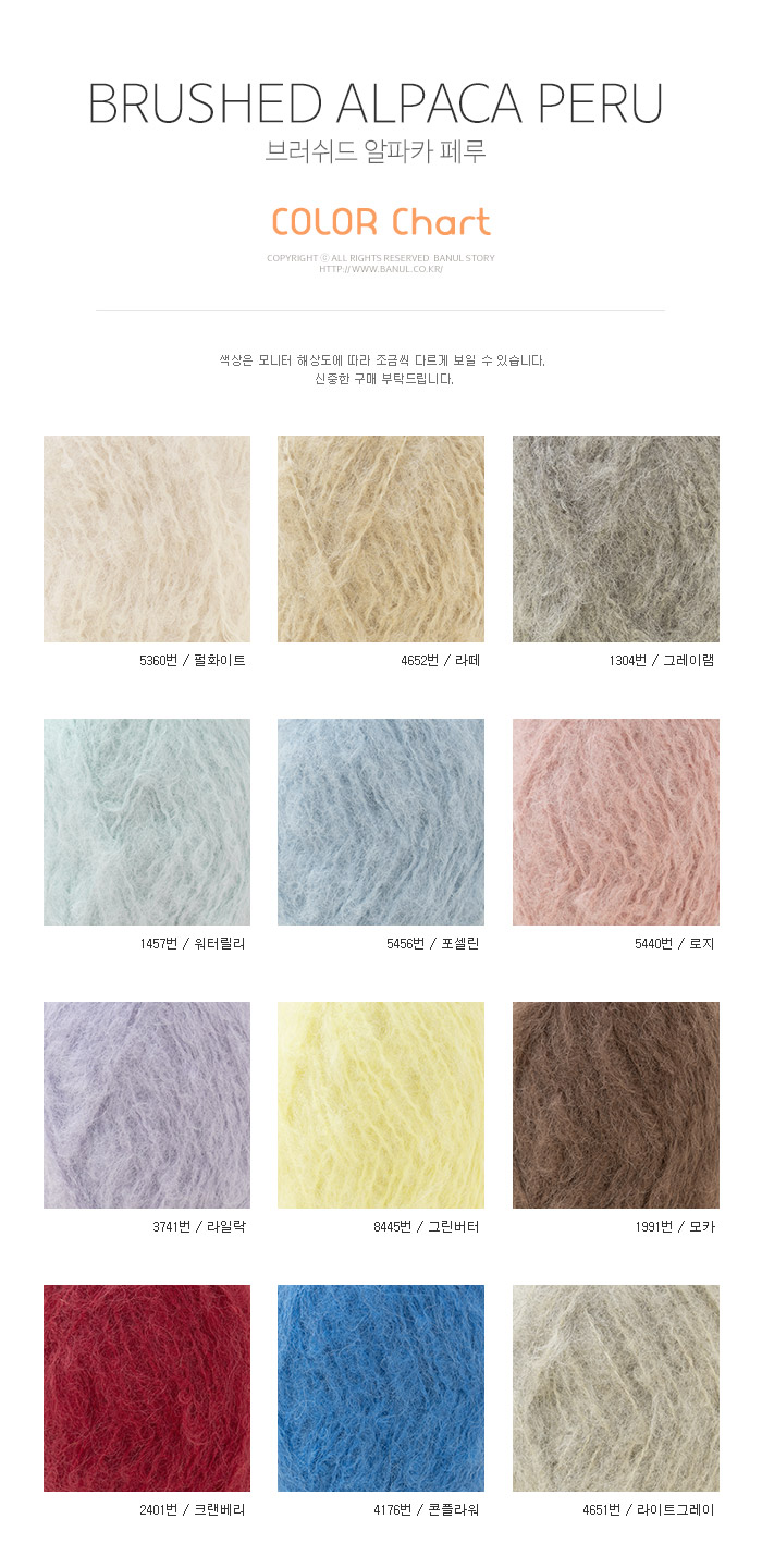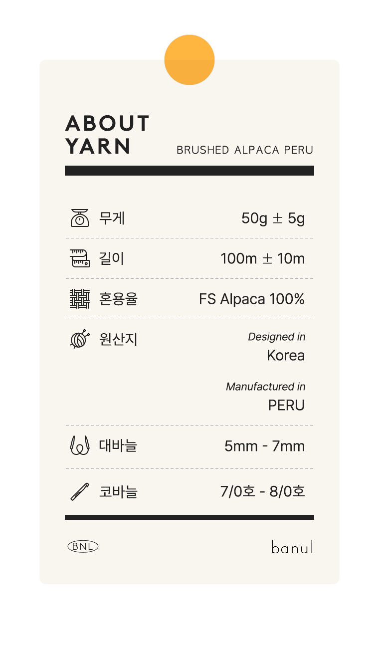 + 부드러운 소재이지만 긴 헤어감 때문에 간지럽다고 느껴지실 수 있으며, 알파카 브러싱 가공 특성상 털빠짐과 털날림이 있는 편입니다. 그럼에도 이런 실만이 나타낼 수 있는 질감 표현이 있기 때문에 풍성한 텍스쳐와 고급 원료를 찾는 분들께 추천드리는 실입니다.