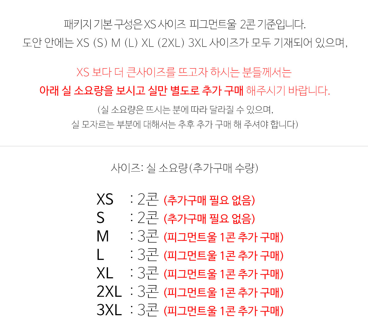 + 제품구성(사이즈 XS 기준): 피그먼트울(색상선택) 2콘 + 도안