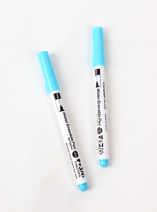+ 실이나 원단에 펜으로 표시 한 후 물을 뿌리거나 세탁을 하면 지워지는 수성펜 입니다.